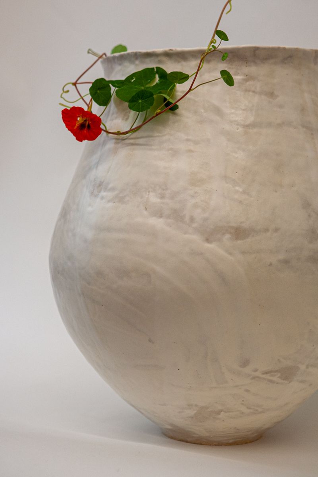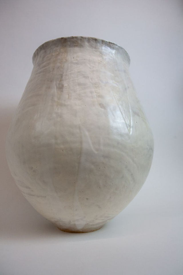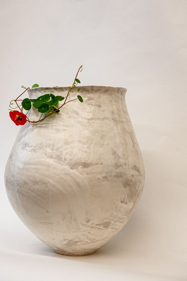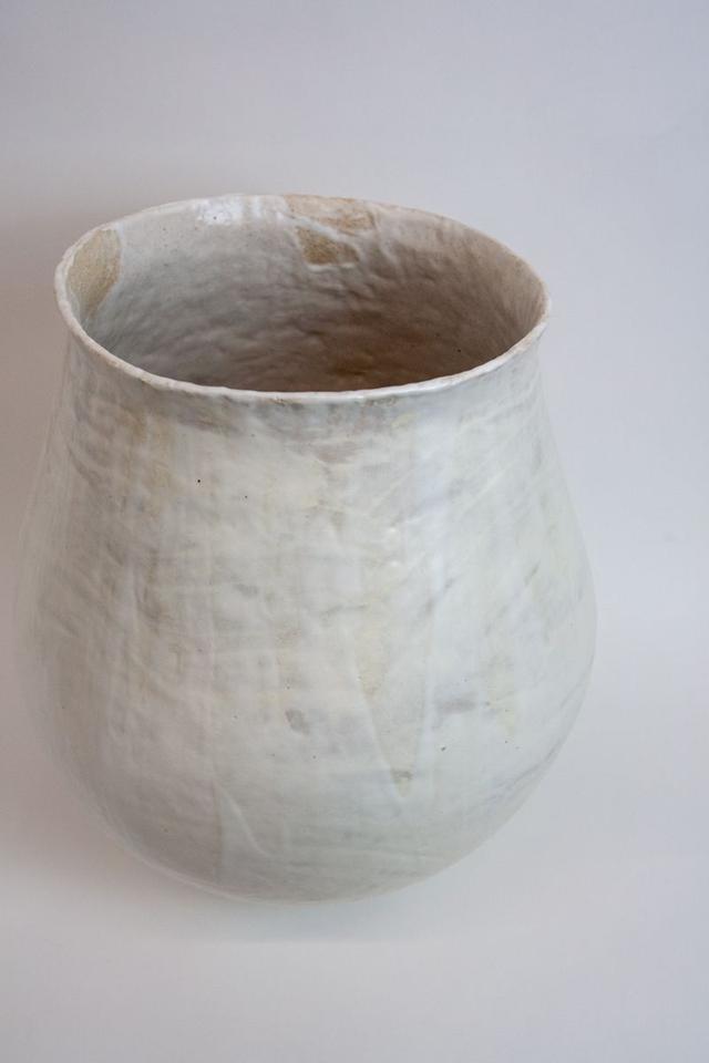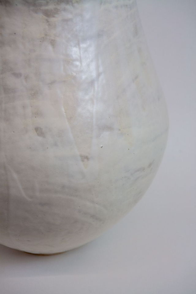 Vase modelé en grès beige chamotté, engobe porcelaine et émail transparent haute température élaboré par mes soins